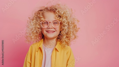 A child with curly blond hair and pink glasses smiles brightly against a pink background, radiating cheerfulness and youthfulness.