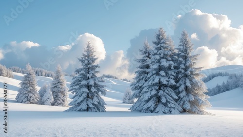A chilly winter landscape featuring snow-covered trees, soft snow drifts, and a clear blue sky. Ideal for design.