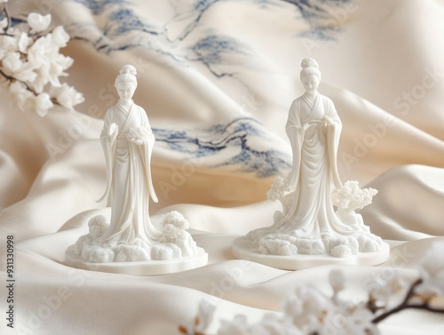 A Chinoiserie-inspired ceramic figurine set displayed on a silk backdrop