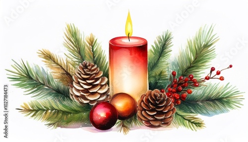 A Christmas festive composition featuring a candle, Christmas tree branches, cones, and Christmas tree toys, illustrated in watercolor technique