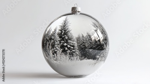 A Christmas ornament with a reflection of snow-covered trees.