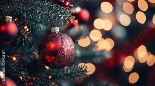 A Christmas tree adorned with red and gold ornaments and twinkling lights, with a blurred background of holiday lights.