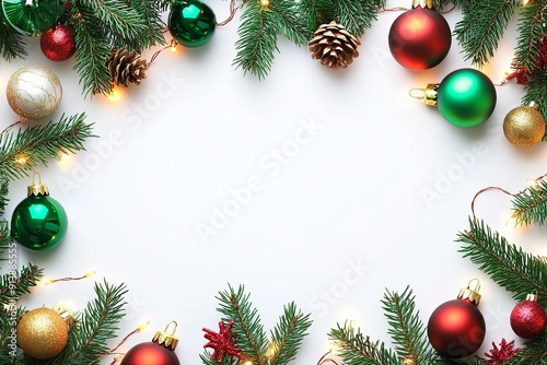 holiday, christmas, winter, decorative, celebration, frame, background, festive, tree, fir, tree branch, christmas, seasonal, red, green, new year, table, december, ornament, white, card, new, year, border, pine, ball, copy space, merry, composition, spruce, banner, greeting, space, design, blank, top, wooden, copy, view, bauble, happy, topview, concept, gift, flat, pattern, tradition