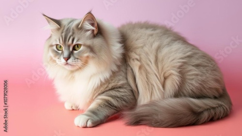 A chubby gray and white cat with a fluffy tail sitting gracefully on a vibrant pink background, leaving plenty of empty space for text or design elements, pets, overweight