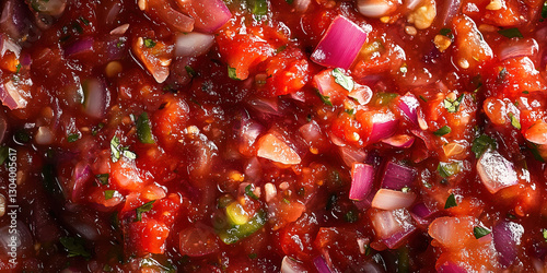A chunky and colorful salsa sauce, macro shot, close-up texture, top view