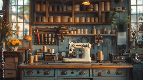dressmaker, workbench, tool, fabric, perfectly, placed, gold, hours, light, detail, rich, texture, sharpened, central, background, blurred, natural, shadow, warm, inviting, atmosphere, hd, quality, colours, high-coloured, style, intricate, cosy, ambience, serene, precise, organised, soft, glow, meticulous, scene, professional, sunlight