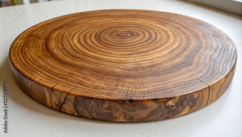 A circular wooden cutting board with a natural grain pattern and a smooth, polished surface.