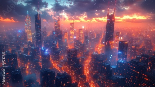 city, skyline, night, glowing, building, bustling, street, highly, realistic