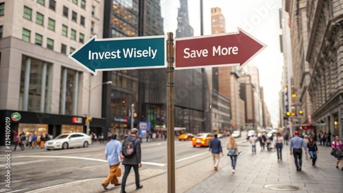 A city street sign points left to "Invest Wisely" and right to "Save More," symbolizing financial choices amidst urban life.