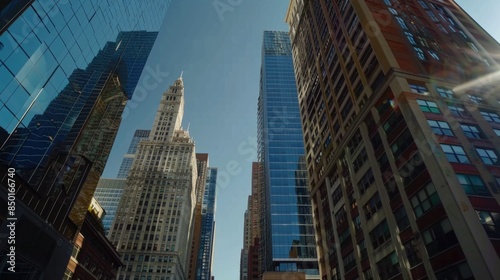A city street with tall buildings and a clock tower, perfect for urban landscapes or time-related concepts