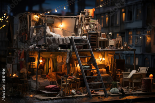 A cityscape at night, with makeshift cardboard shelters illuminated by dim streetlights, depicting the struggles faced by the homeless after dark. Generative Ai.