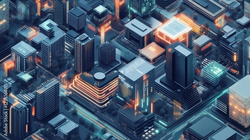 A cityscape with buildings shaped like computer components, representing the integration of technology into urban life.