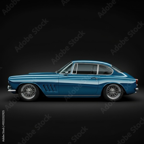 A classic blue vintage car is showcased against a seamless black background, emphasizing its sleek curves and lines.