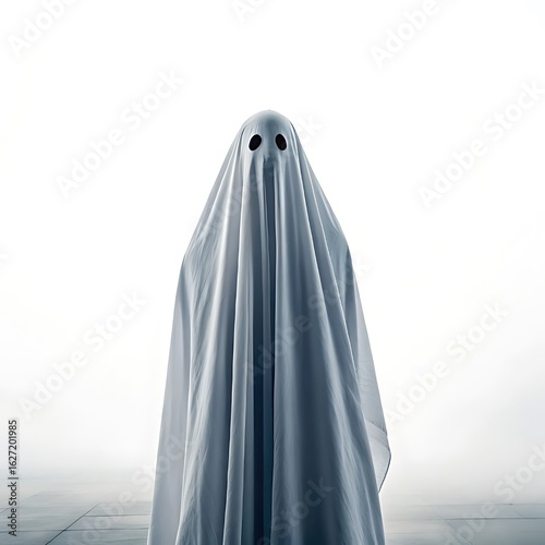 A classic ghost figure made from a white sheet with two black holes for eyes, standing against a stark, hazy white background, evoking a minimalist and eerie atmosphere.