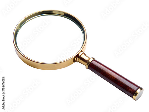 A classic magnifying glass with a wooden handle and golden rim, isolated on transparent background