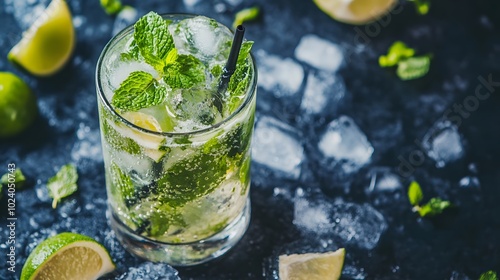 A classic mojito cocktail, with fresh mint leaves, lime wedges, and crushed ice.