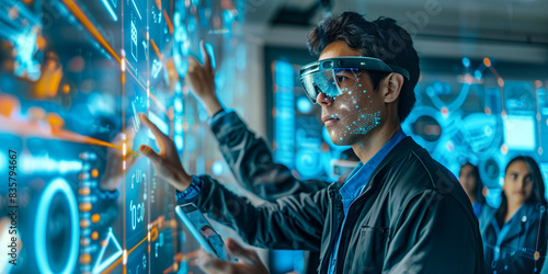 A classroom of the future where students are using augmented reality glasses and interactive digital whiteboards