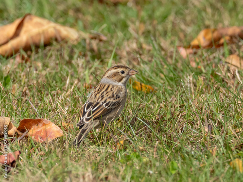 A Clay-colored Sparrow feeding on the ground in short grass