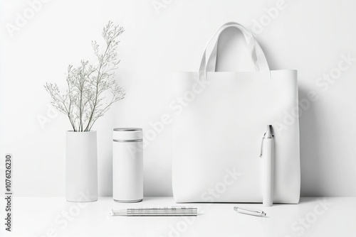 A clean and minimalist mockup of a promotional item featuring a tote bag, thermos, notebook, and pen, with all the products in white.generative ai