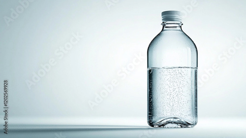 A clean and minimalistic blank water bottle mockup on a white background with blurred edges, offering empty caption space on the side for personalized design elements and modern presentation style