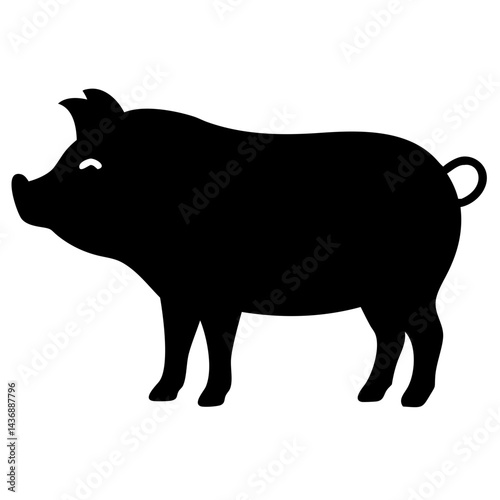 A clean, black silhouette of a pig standing in profile, with a focus on its distinctive shape and curly tail, isolated on a white background