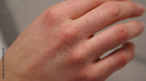 A clean, close-up shot of a person's hand with dry, chapped skin and fine red lines.