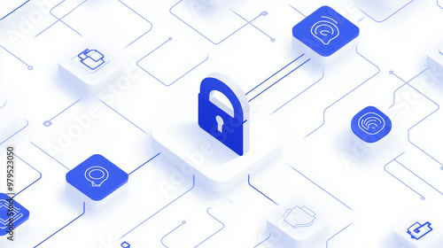 A clean, modern illustration showcasing various cybersecurity elements, including a lock icon, a firewall, a key, and a digital fingerprint, all connected by network lines. The bac
