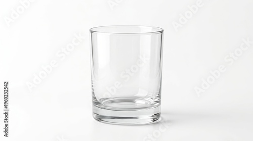 A clear, empty cylindrical glass tumbler stands isolated against a clean white background, showcasing its simple design and transparency.