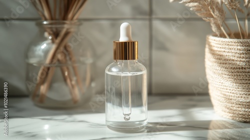 A clear glass bottle with a dropper, ready for your favorite skincare or essential oils. It has a simple design and sits nicely on a marble shelf. Perfect for beauty products!