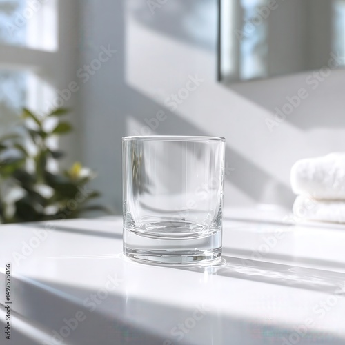 A clear glass cup on white bathroom counter, soft sunlight hitting from side, subtle mirror reflection behind, no other objects, clean minimal style, transparent aesthetic.