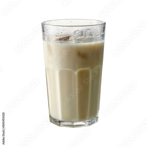A clear glass filled with cold white milk and ice cubes, isolated on a clean white background.
