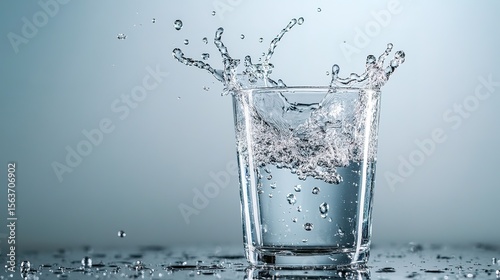 A clear glass of water with a dynamic splash frozen mid-air against a light background.