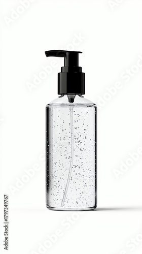 A clear plastic bottle with a black pump dispenser contains a transparent liquid with small bubbles, isolated on a white background.