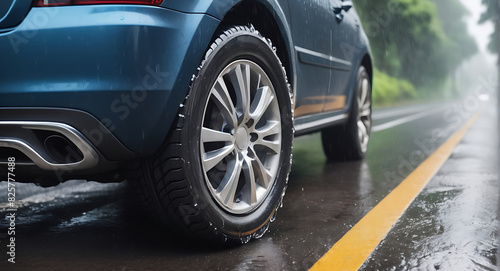 a close up of a Car tire on a wet road in rainy day, selective focus with copy space