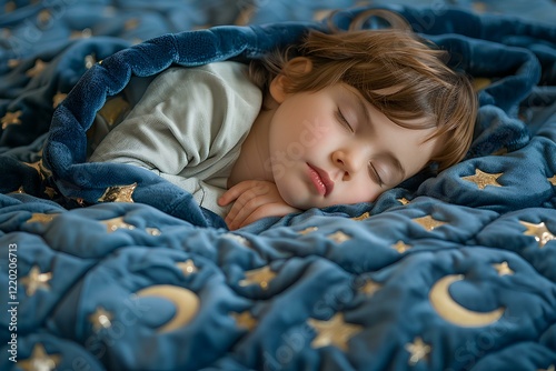 A close up of a child sleeping on a bed