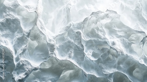 A close up of a white and grey ice formation. The ice is rough and jagged, with many small holes and crevices. Scene is one of coldness and isolation