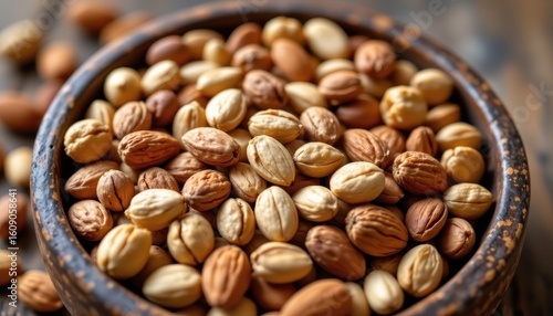 close, up, almond, walnut, sunflower, seed, rustic, bowl, magnesium, rich, nut, variety, natural, style, ai, generative