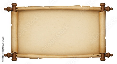 A close up of an antique scroll with wooden handles on a white background for text placement use