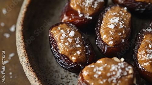 A close up of fresh dates stuffed with almond butter and sprinkled with sea salt, styled on a rustic plate