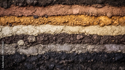 A close up shot showcasing distinct layers of soil with varying colors and textures in a horizontal view