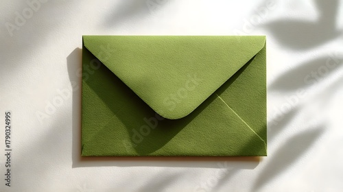 green, envelope, leaf, shadow, paper, stationery, mail, letter, message, communication, office, business, invitation, card, document, folded, geometric, shape, clean, simple, minimalist, natural, organic, light, shadow, plant, texture, background, surface, blank