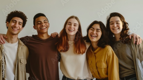 A close-knit group of friends with arms around each other, beaming smiles, and a plain background, capturing the essence of camaraderie, unity, and youthful exuberance.