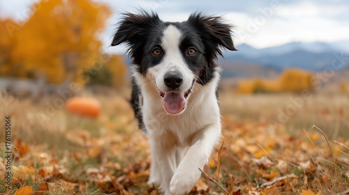 dog, border collie, autumn, pet, fall, animal, walking, happy, outdoors, nature, leaf, season, park, canino, puppy, purebred, sheepdog, portrait, running, playful, active, friends, companion, mammal, field, grass, foliage, tree, landscape, countryside, rural, mountain, pumpkin, halloween, thanksgiving, black-and-white, fur, eye, tongue, paw, joy, closeup, front view, eye contact, blurred background, bokeh, adorable
