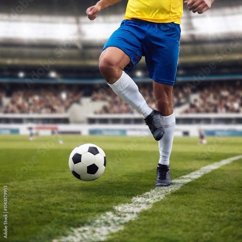 A close-up full shot of a soccer player in action, running toward the goal with the ball at their feet. The entire field and stadium are in deep focus, emphasizing the intensity of the moment from an
