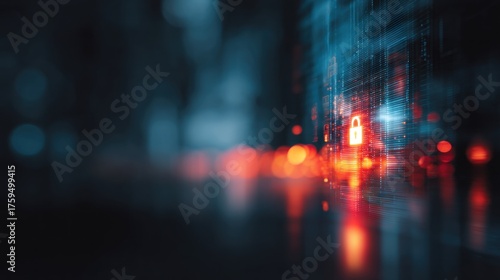 A close-up image featuring a digital padlock symbol, glowing against a backdrop of blue and red lights, suggesting themes of cybersecurity and data protection.