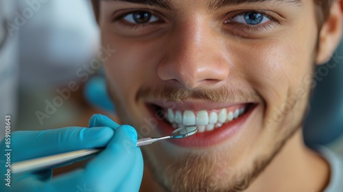 A close-up image of a dental check-up showing a dentist using medical tools to examine a patient's teeth, highlighting the importance of oral hygiene and dental care.