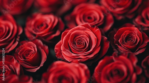 A close-up image of vibrant red roses showcasing their delicate petals and lush texture in full bloom.