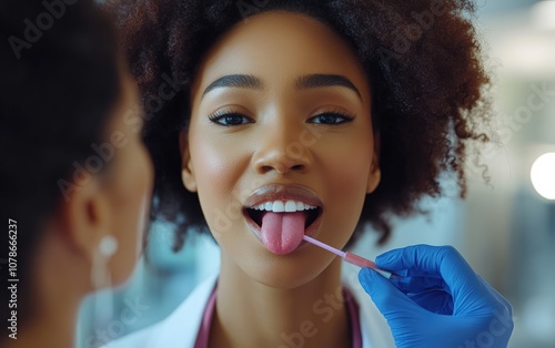 doctor, patient, health care, medicals, exam, exam, throat, swab, tongue, check-up, healthcare professional, glove, blue, female, woman, young, smiling, trust, care, human relationships, routine, closeup, portrait, medical office, blurred background, light, bright, positive, health, wellness, clinic, hospital, medical equipment, diagnostic, treatment, prevention, health care, medical care