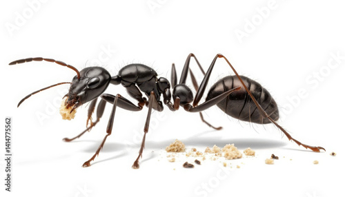 A close-up of a black ant foraging for food, showcasing its detailed features and texture against a clean, white background.