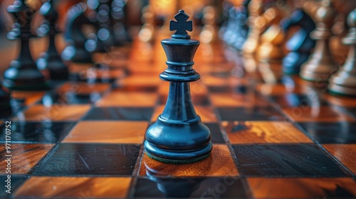 A close-up of a black king chess piece on a wooden chessboard during a match, highlighting strategy and concentration. Generative AI